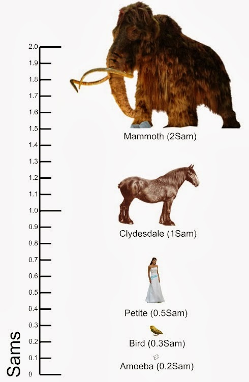 When stating my dimensions, I commonly round myself off and say I, Sam, am about 6'7" and 220lbs. But, more accurately, and using the units any responsible Canadian should, I am 2m and 100kg. What a wonderfully exact set of dimensions! In celebration of this, I propose a new unit for use in quantifying length and mass henceforth to be known as the SAM (equal to exactly 200m·kg). Note that the SAM is a metric entity and thus all the standard prefixes apply. For example, there is the MegaSAM (MSAM), kiloSAM (kSAM), milliSAM (mSAM) etc.